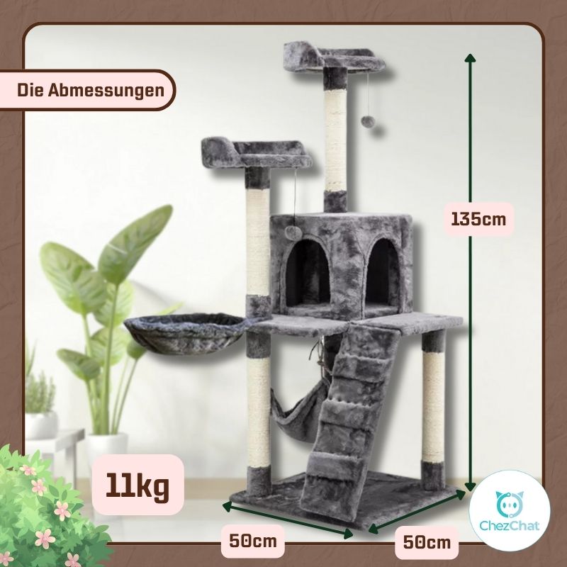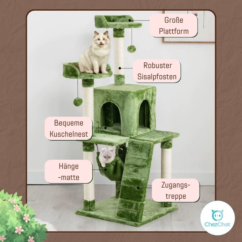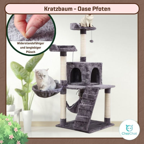 Der Kratzbaum - Oase Pfoten von ChezChat bietet deinen Samtpfoten den ultimativen Rückzugsort. Mit seinen verschiedenen Ebenen und zahlreichen Spielmöglichkeiten wird dieser Katzenkratzbaum schnell zum Lieblingsplatz deines pelzigen Freundes. Ob Klettern, Kratzen oder Entspannen – dieser Kratzbaum für Katzen erfüllt alle Bedürfnisse und fügt sich mit seiner eleganten Optik perfekt in dein Zuhause ein.
