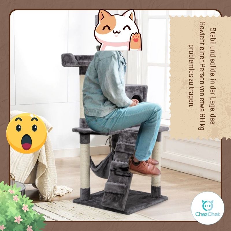 ChezChat legt großen Wert auf Nachhaltigkeit und verwendet für den Kratzbaum - Oase Pfoten nur umweltfreundliche und recycelbare Materialien. Die strapazierfähigen Sisal-Säulen ermöglichen es deiner Katze, ihrem natürlichen Kratztrieb nachzugehen, ohne dass deine Möbel Schaden nehmen. Der weiche Plüschstoff sorgt für ultimativen Komfort – perfekt zum Einkuscheln nach einem ausgiebigen Krallenwetzen. Für Liebhaber eines natürlichen Looks ist dieser Kratzbaum aus Natur die perfekte Wahl, um nicht nur Funktionalität, sondern auch Stil in dein Zuhause zu bringen.